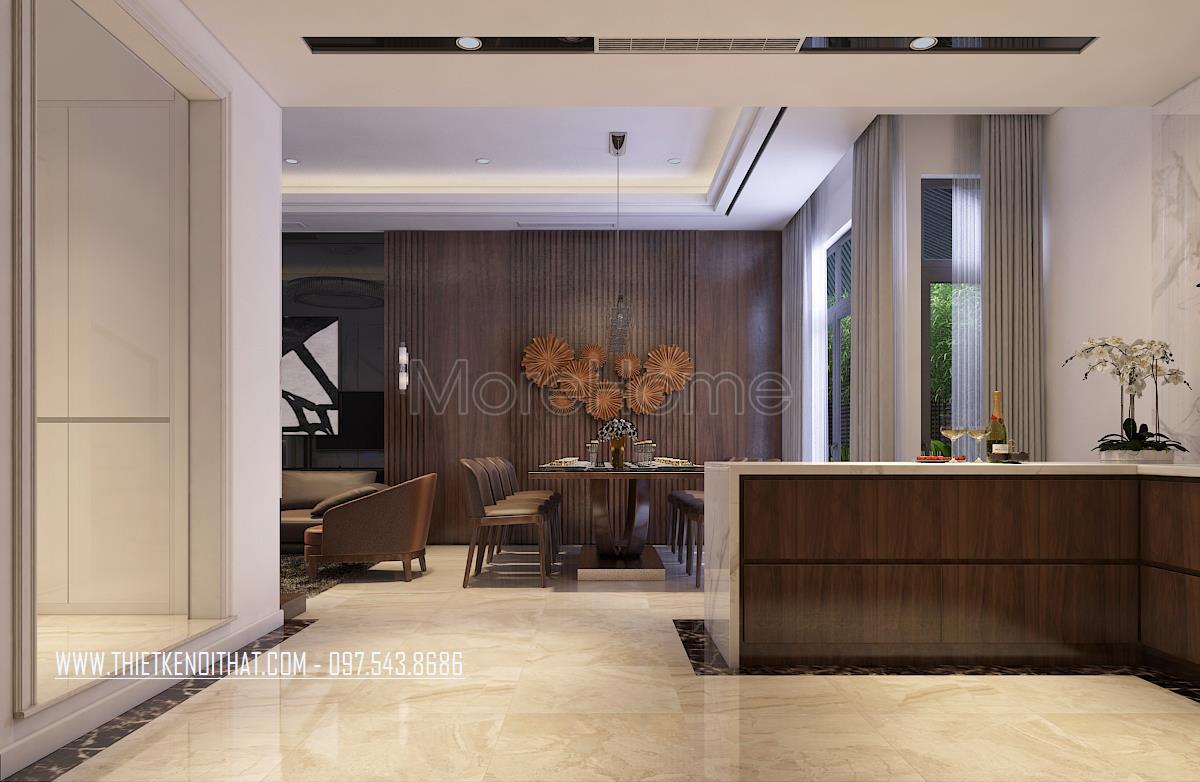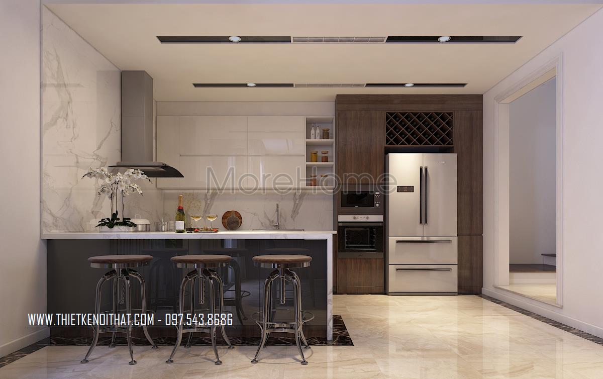 Thiết kế phòng bếp : khu bếp được bố trí rộng rãi theo hình chữ U kết hợp với bàn bar. Tủ lạnh side by side đặt ở vị trí hợp lý nhất khi sử dụng. Tủ bếp được thiết kế với 2 màu gỗ mà sơn trắng. Chất liệu đá được sử dụng để ốp bàn bếp cũng như tường bếp. Mang đến sự sạch sẽ và dễ lau chùi. Bàn bả được bố trí ba ghế ngồi là nơi chủ nhà có thể nhâm nhi những ly rượu vang cũng là nơi sửa soạn bữa ăn cho gia đình.